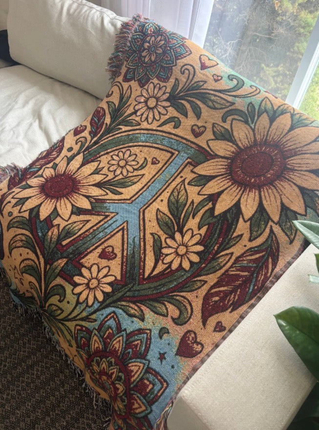 Wrap your space in the warmth of serenity with versatile woven pieces designed to be enjoyed as both blankets and rugs. Adorned with peace signs, sunflowers, hearts, and flourishing plants, each design radiates harmony, comfort, and timeless bohemian beauty—bringing calm, character, and soul to any room. 🌻✌️